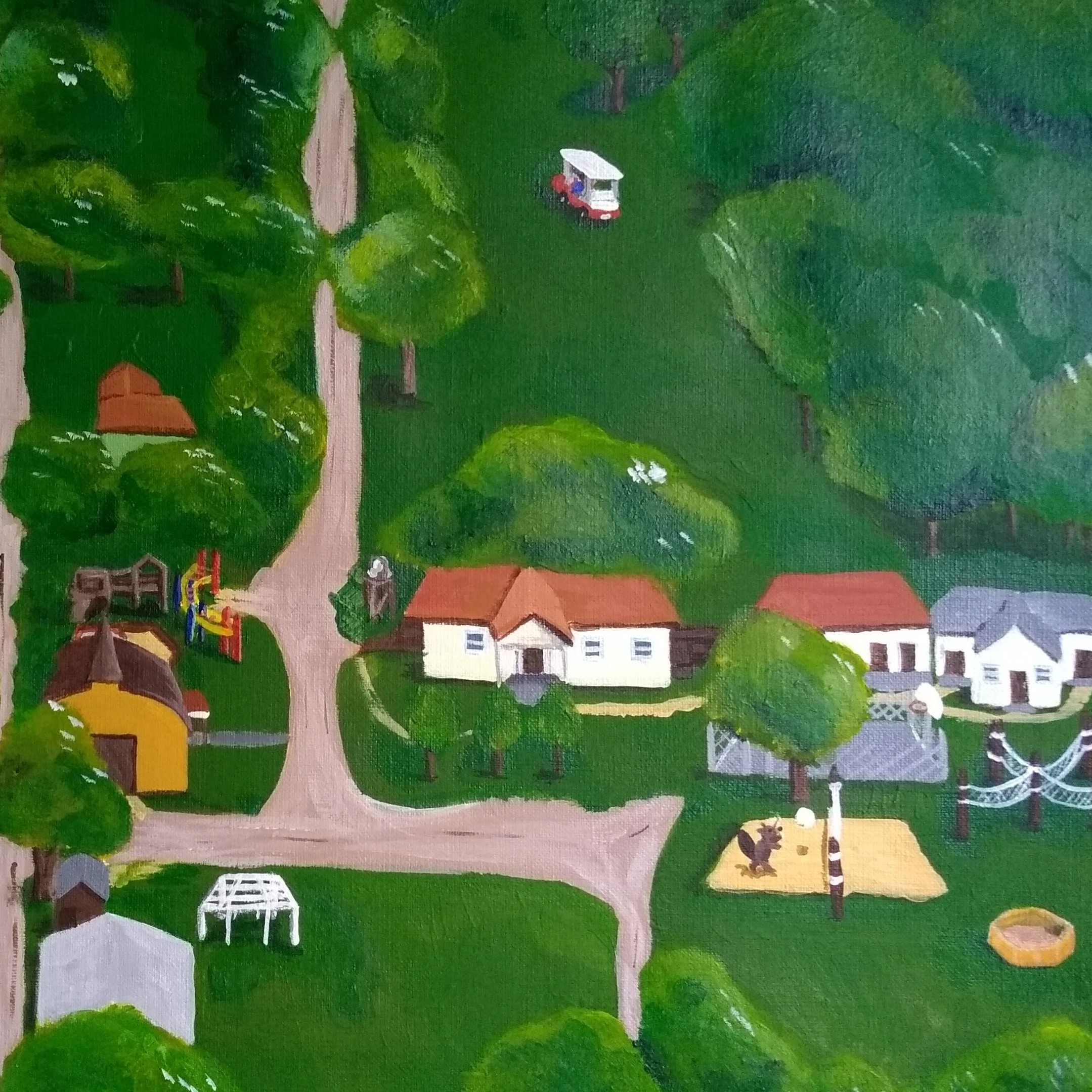 My favorite addition to the map was the iconic Beavicorn playing volley ball on the sand volley ball court. The Beavicorn (part beaver and part unicorn) came to be during my summers serving at the camp and I love that he las lived on. Of course, I had to include the notorious golf cart as well, the distance from the camp entrance down to the waterfront is no quick trip, and the golf carts are a must for camp staff!