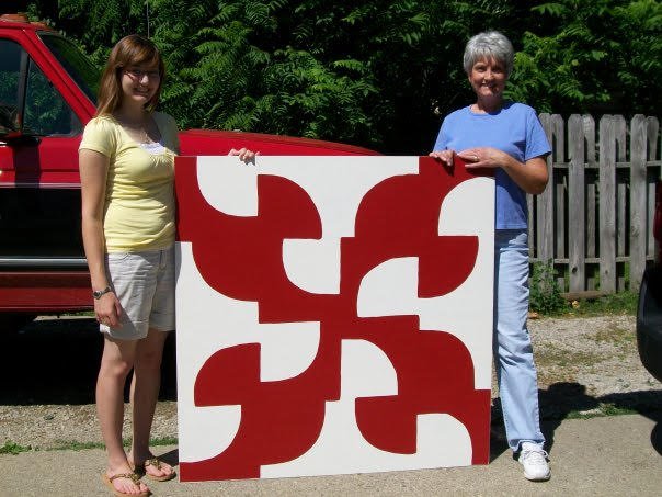 Dr. Kathleen Booher chose the Drunkard’s Path quilt pattern in red and white for her barn quilt. Using a stencil created from a 1 foot square board, I traced the pattern onto four 4 feet by 4 feet square boards. Once the pattern had been traced onto the boards, they were primed and painted with outdoor quality house paint.