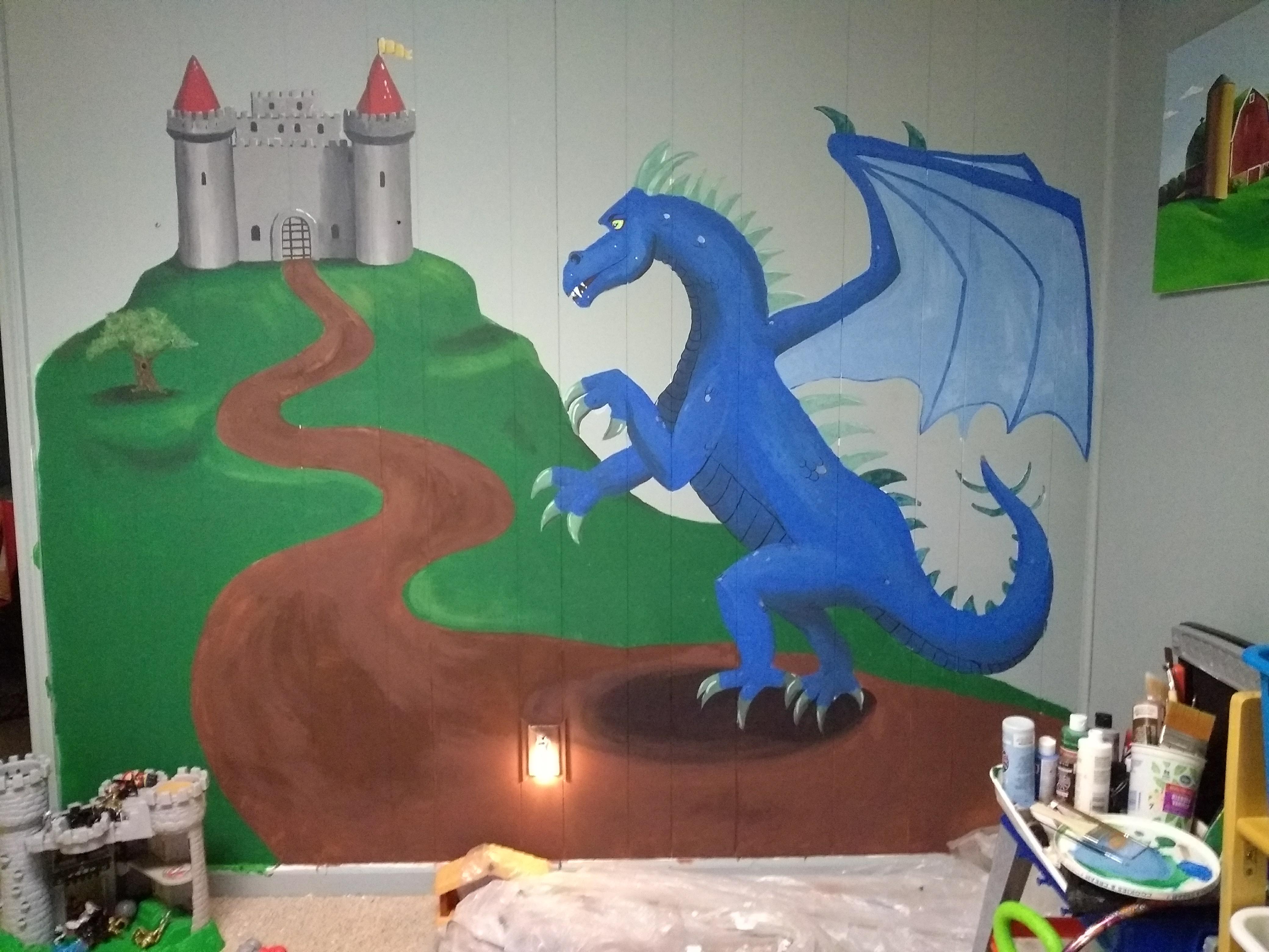 Recently, I had the opportunity to paint a fun fairytale themed mural in a basement play room. As a former child who had a fondness for castles and dragons this was especially enjoyable.