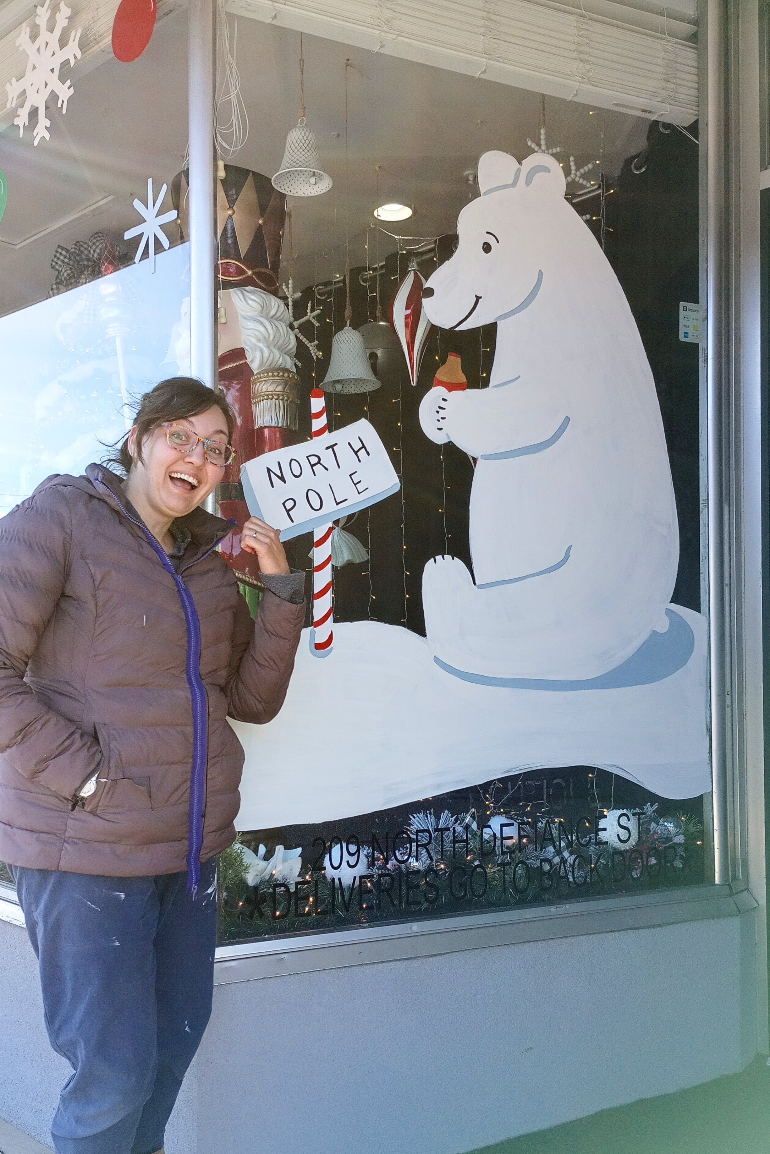 Window art is a temporary and eye-catching way to draw attention to your business, especially during the holiday season. Below are examples of past holiday windows. Contact me for your holiday window consultation.